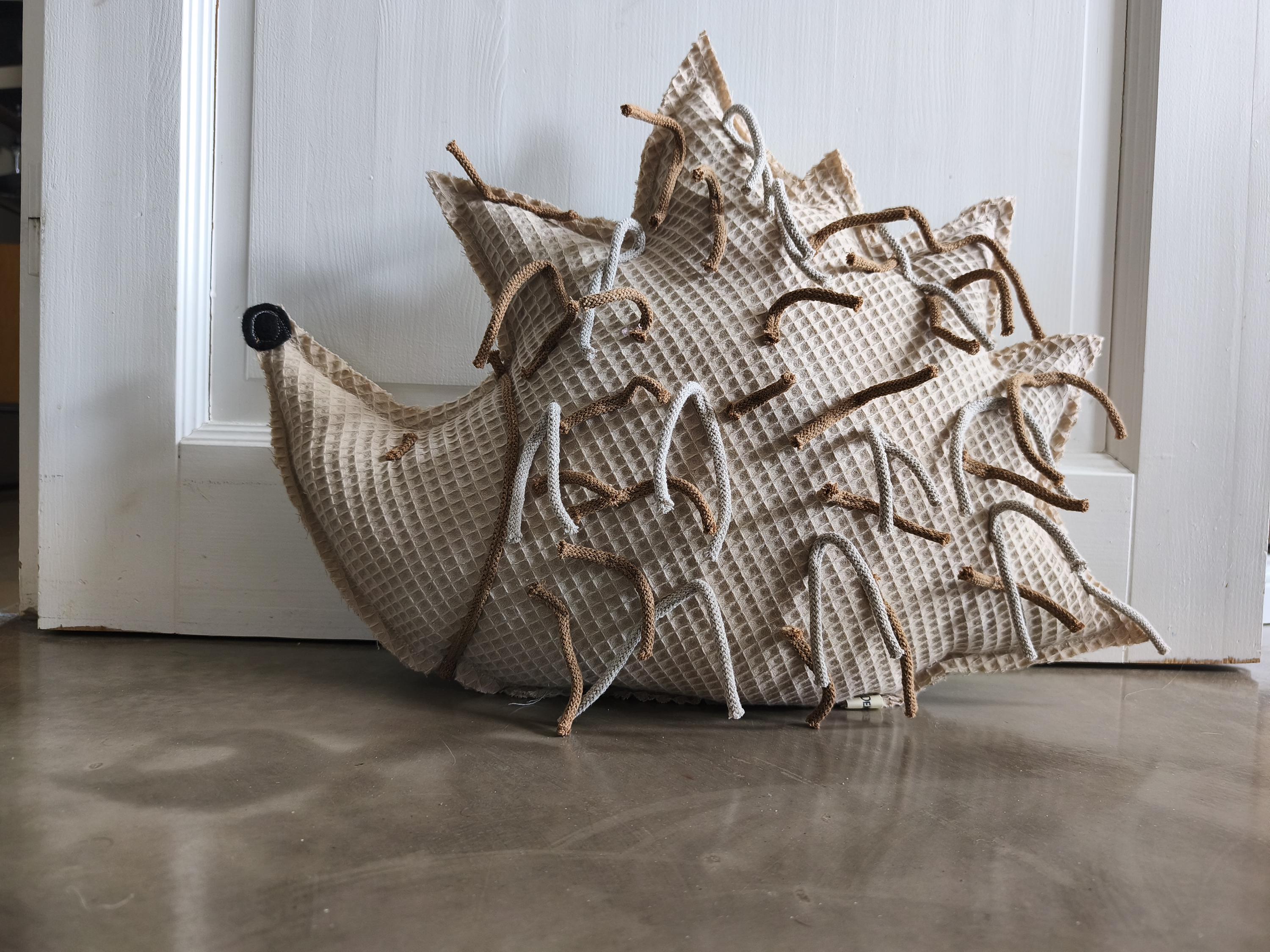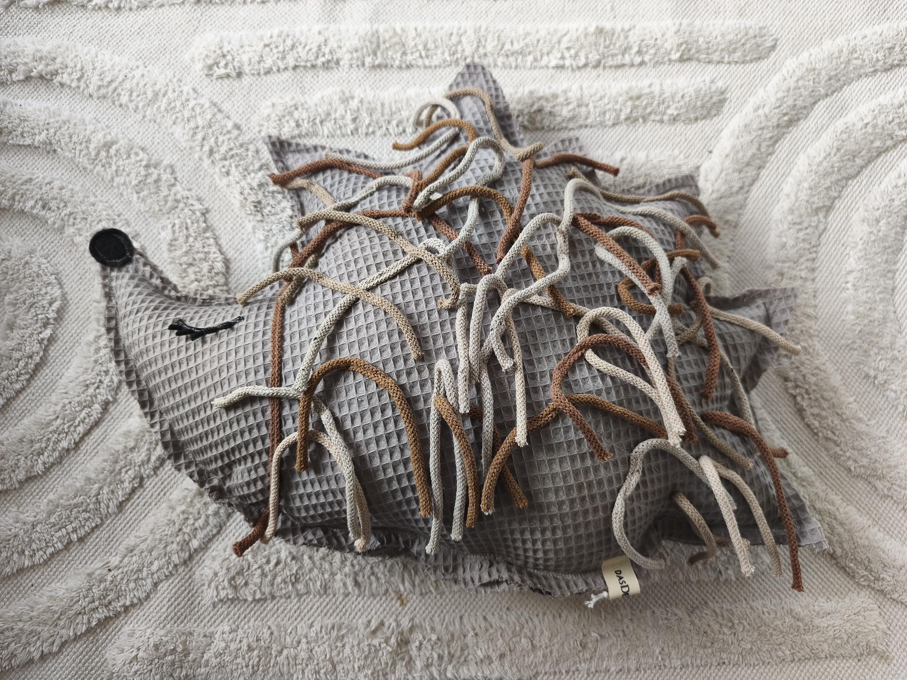 Hand-twirled hedgehog-shaped cuddly pillow.