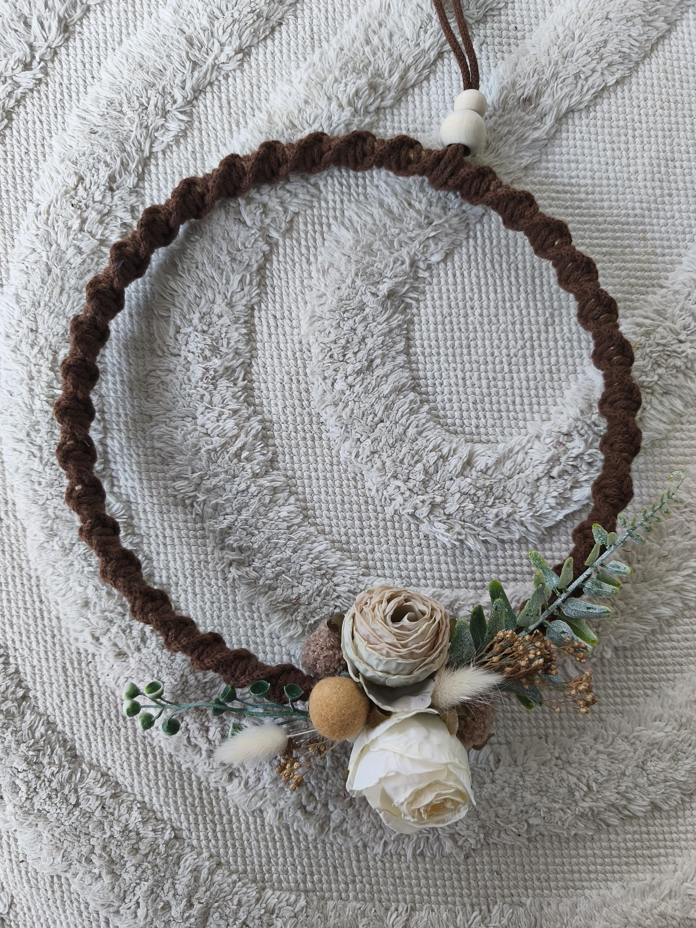 This enchanting macrame dried flower wreath, measuring 25 cm in diameter, is the perfect decorative piece for any home. It combines hand-knotted macrame with a beautiful selection of dried flowers, creating a natural, rustic flair. The wreath is ideal for wall decoration, as a door ornament, or for special occasions such as weddings or celebrations.