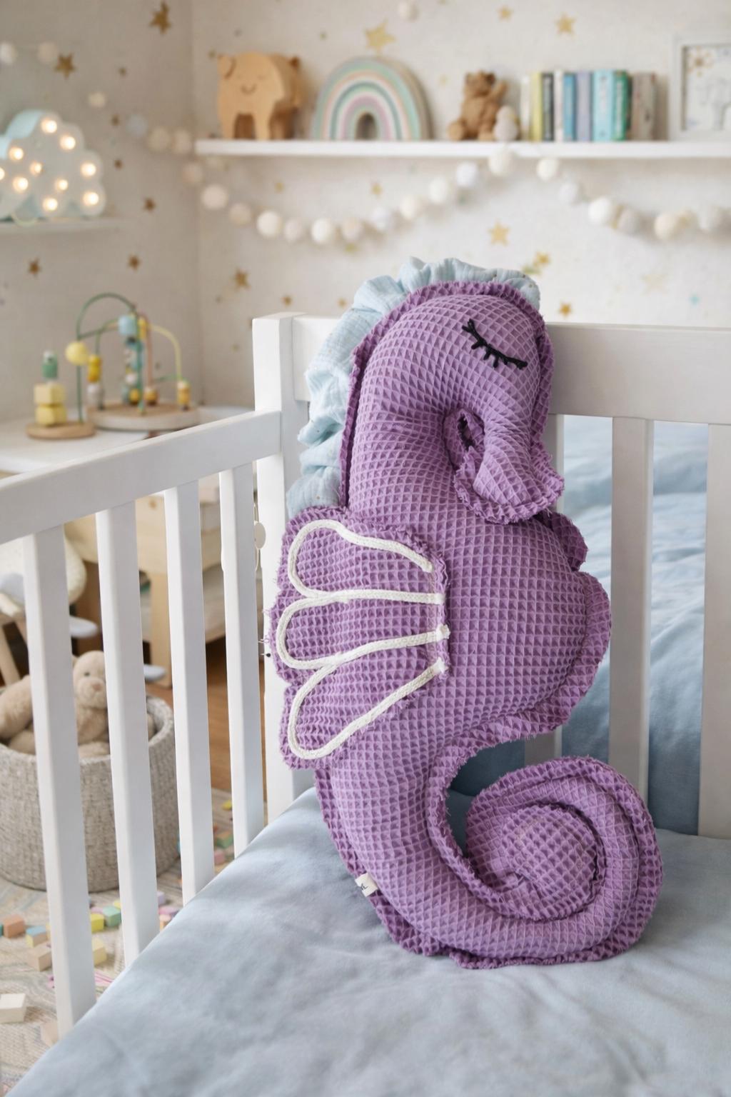 This enchanting seahorse pillow brings a touch of maritime lightness and gentle comfort to any child's room. With its soft waffle texture and charming details like the embroidered eyelash and decorative corded fin, it will quickly become a favorite companion for cuddly toys of all ages.