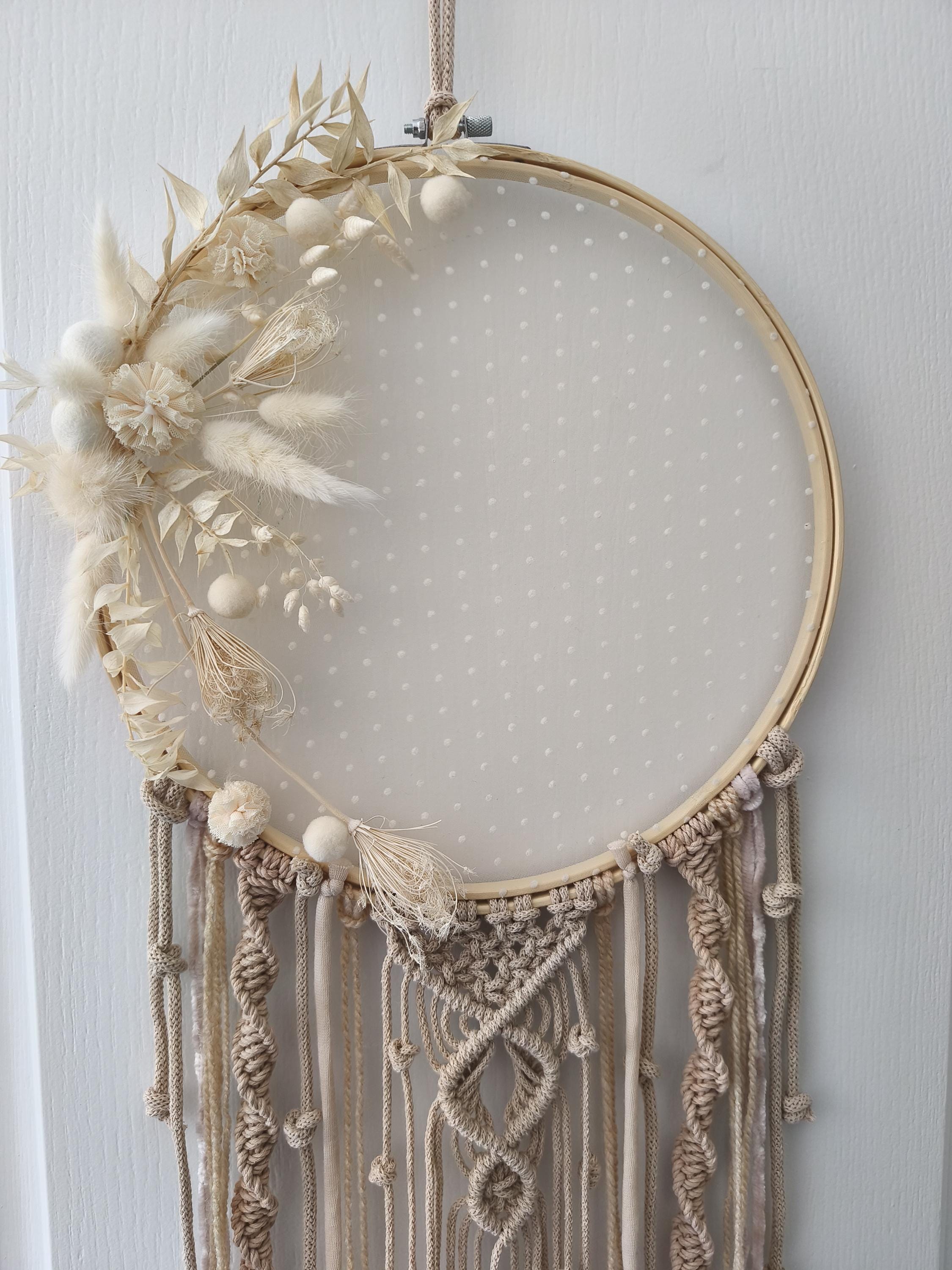 This lovingly handcrafted dreamcatcher brings a warm, calm, and natural atmosphere to your home. With delicate dried flowers, soft natural tones, and fine macrame knotting, it's the perfect decorative element for boho, Scandinavian, or minimalist interior design styles.