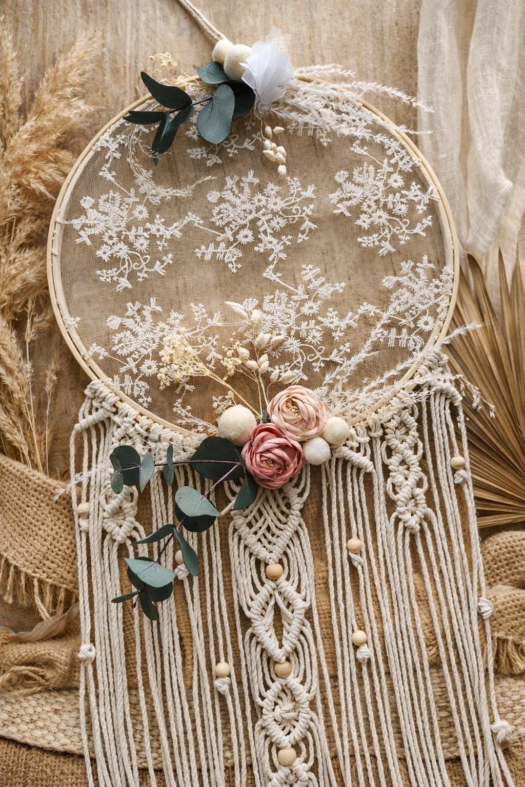 Hand-twisted dreamcatcher with lace and macrame elements.