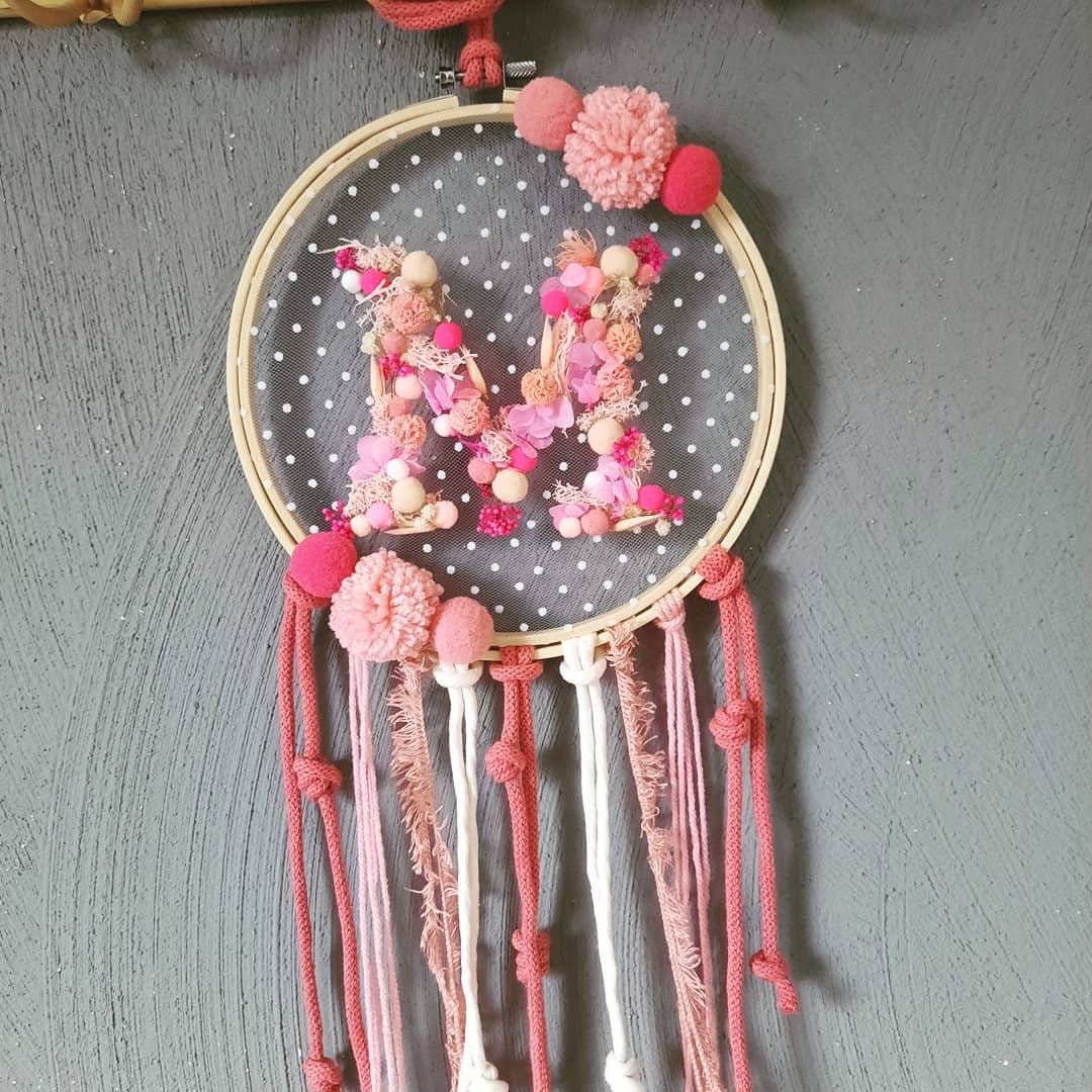 I have a beautiful embroidery frame with dried flower letters and white polka dot tulle for you.