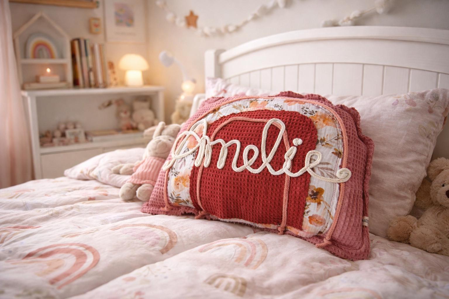 This beautiful, handcrafted name pillow is more than just a decorative pillow – it's a cherished personal companion for your child. Made with meticulous attention to detail and individually personalized with the chosen name, each pillow is truly unique.